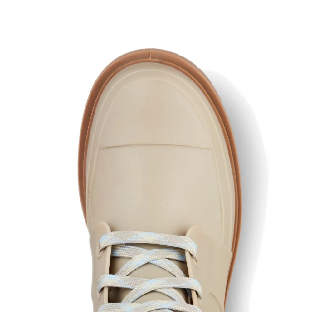 Cougar Madrid Rain Boot is mid-height Rubber-like compound rain combat boot. Rounded toe. Front closure with flat waxed lace. Rubber-like compound outsole with 1.25 inch block heel.