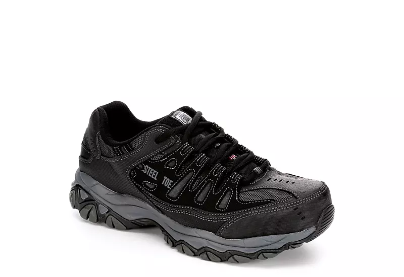 Keep ahead of every challenge in the 77055 men’s work sneaker from Skechers. This silhouette is ready for anything with it’s steel toe and high abrasion textured leather upper. Not only does it provide extreme traction with it’s lug patterned sole but it features a comfortable Memory Foam insole and Relaxed Fit® design.